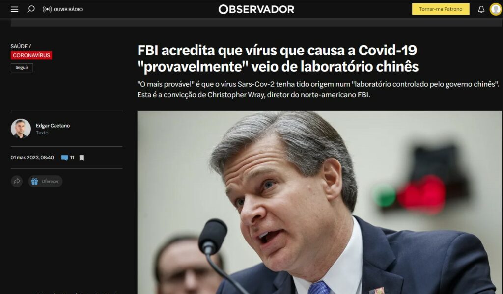Mas centremo-nos, por agora, no Edgar Caetano, que hoje, no Observador – tal como muitos outros media mainstream – fez eco da “convicção de Christopher Wray, diretor do norte-americano FBI, que acredita que poderá ter havido um ‘incidente’ num laboratório e que o regime chinês ‘tem feito o seu melhor para ofuscar’ os esforços para identificar a origem do vírus”.