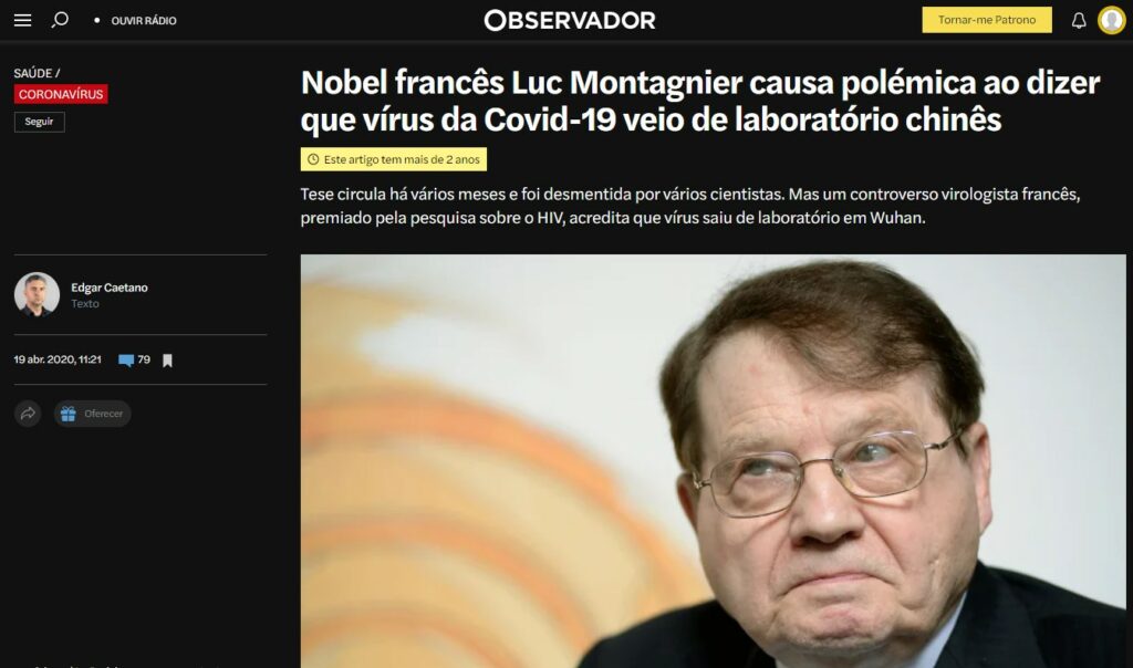 Reza assim essa infame “peça” de Edgar Caetano: “A teoria circula há vários meses e já foi desmentida por vários cientistas. Mas um controverso virologista francês laureado com o prémio Nobel pela pesquisa sobre o HIV, Luc Montagnier, acredita que o vírus saiu de laboratório em Wuhan e defende que a explicação mais consensual – uma transmissão com origem num ‘mercado vivo’ da cidade chinesa – é uma ‘história da carochinha’. A declaração está a causar polémica, com outros investigadores a descredibilizar Montagnier, considerando que o investigador premiado tem estado ‘em decadência acelerada nos últimos anos’.”