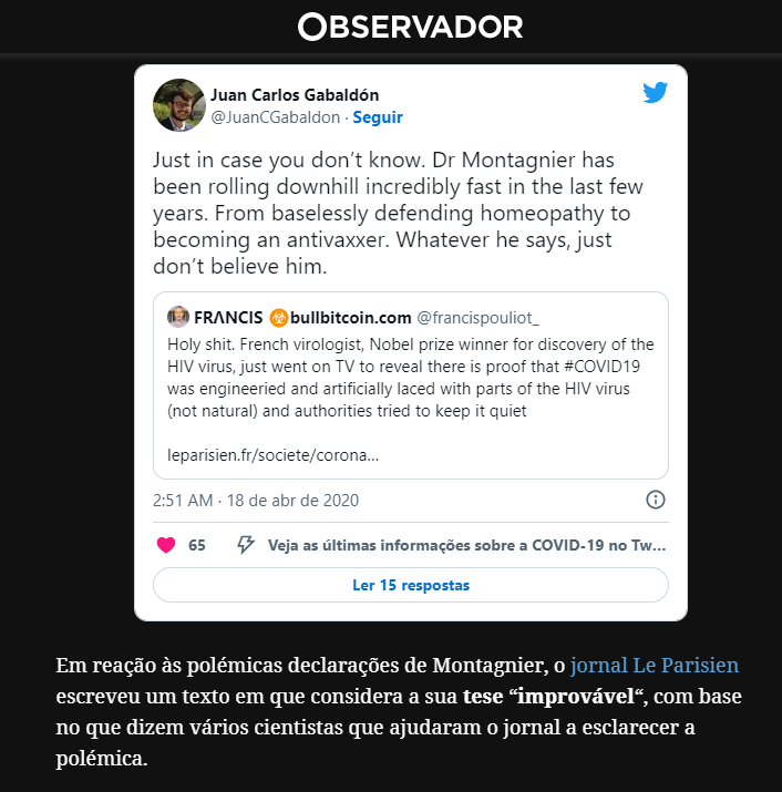 Na mesma linha, e usando exactamente o mesmo tweet do obscuro estudante de doutoramento para sustentar o descrédito de Montagnier, seguiu a jornalista Teresa Campos, da revista Visão, em 20 de Abril de 2020. Descredibilize-se o mensageiro para descredibilizar a mensagem – eis a receita infalível dos cretinos.