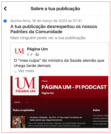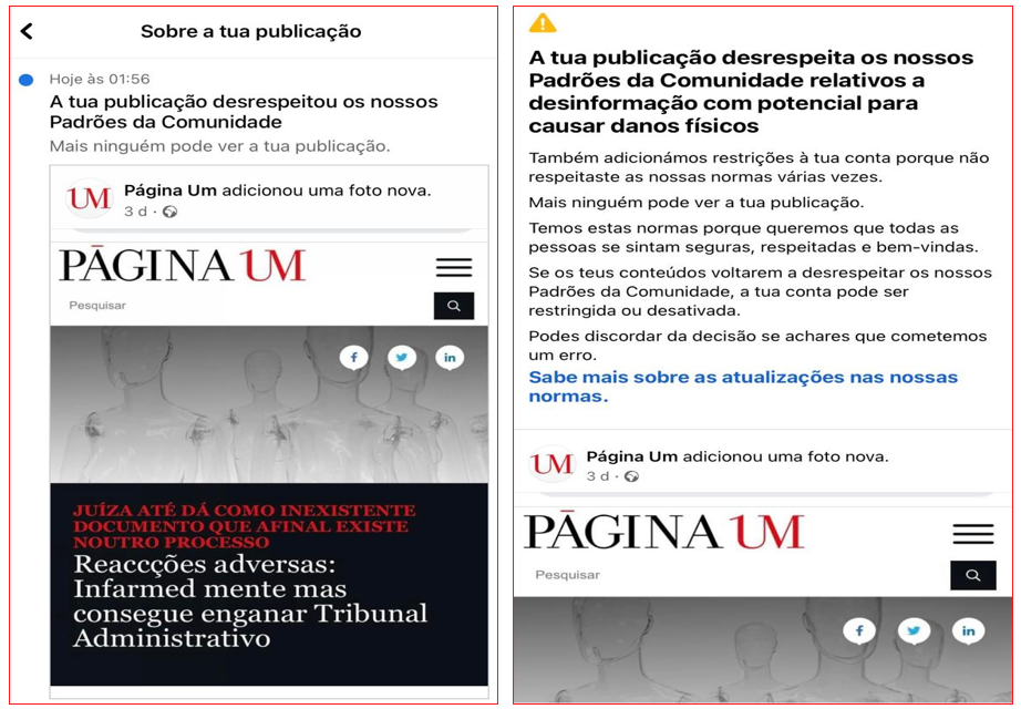Uma das notícias banidas é sobre o processo de intimação do PÁGINA UM no Tribunal Administrativo de Lisboa contra o Infarmed. O nosso “crime”, para o Facebook, será estar a lutar nos tribunais pelo acesso a informação sobre reacções adversas das vacinas contra a covid-19 e do antiviral remdesivir. Para o Facebook, a notícia do PÁGINA UM constitui “desinformação com potencial para causar danos físicos“.