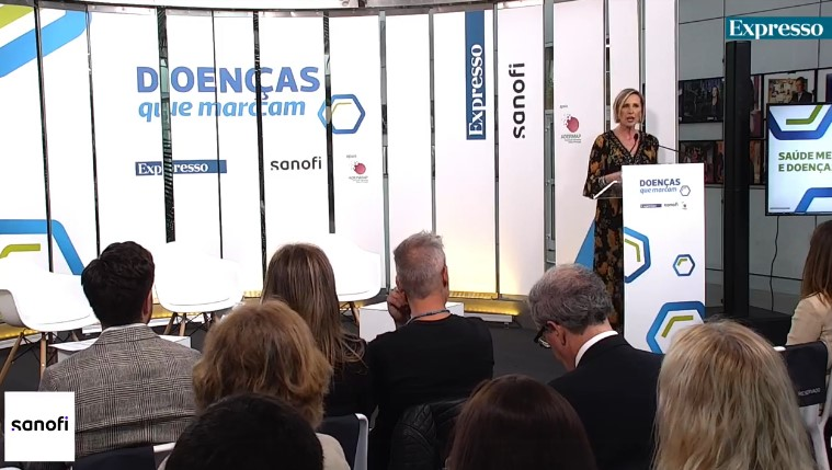 A jornalista e pivot da SIC Marta Atalaya durante uma conferência no âmbito de uma parceria comercial entre o seu empregador e uma farmacêutica.