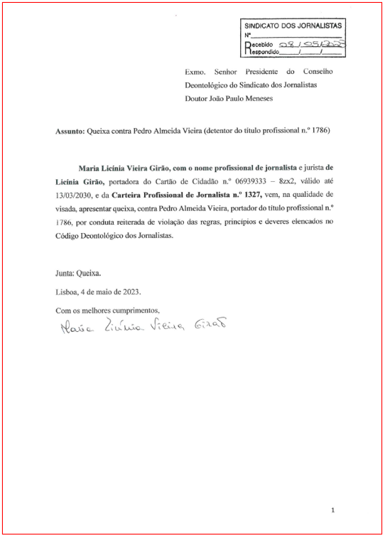 Apresentando uma queixa formal ao Conselho Deontológico do Sindicato dos Jornalistas. Leitura aprazível para quem acha que o Jornalismo ainda não desceu ao fundo do poço – e, por uma questão de transparência, deve ser publicamente conhecida.