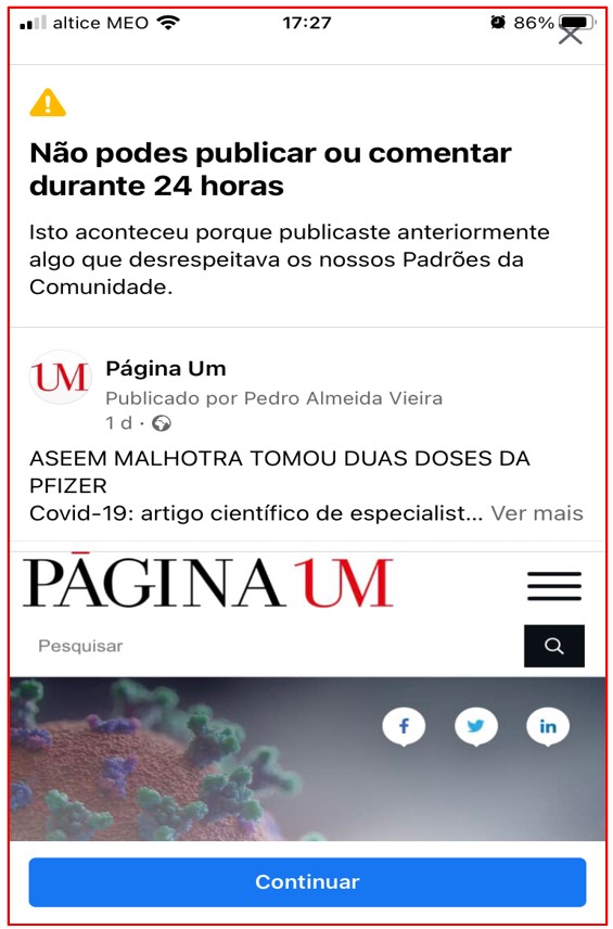 Aliás, o PÁGINA UM noticiou as conclusões do artigo científico e foi alvo de censura no Facebook, que apagou também o post sobre a notícia, num aparente “processo de silenciamento em curso“.