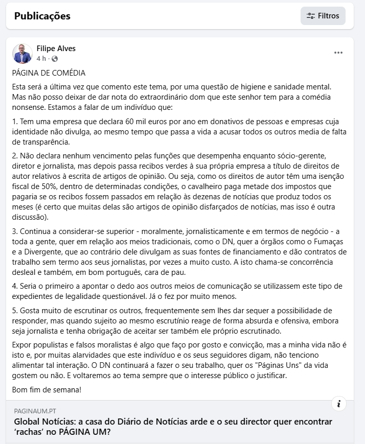 Disfarçado de análise isenta, Filipe Alves coloca lado a lado três projectos jornalísticos: mas só o PÁGINA UM é empresa — e, por isso, sujeito a especiais deveres de transparência contabilística; só o PÁGINA UM exibe verdadeira sustentabilidade financeira; e só o PÁGINA UM cumpre o objectivo de viver exclusivamente de donativos dos leitores. Ainda assim, é apenas o PÁGINA UM que, aos olhos de Filipe Alves, surge como o pecador a violar a lei e a ocultar transparência.
