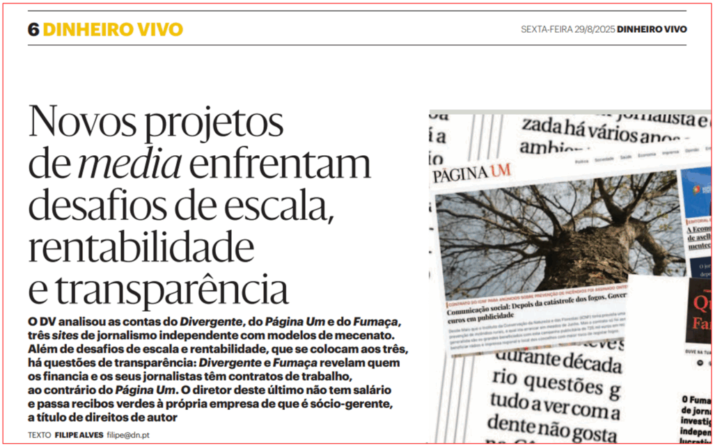 Ontem à tarde, e dias depois de o PÁGINA UM ter revelado a falência técnica da Global Notícias (com capitais próprios negativos de quase 20 milhões de euros e custos operacionais de 47,3 milhões de euros), o director do Diário de Notícias, Filipe Alves, informou-nos via e-mail estar, ele próprio, a fazer uma investigação que envolve a gestão financeira do PÁGINA UM, conhecida dos leitores aqui, na Base de Dados das Contas Anuais e também no Portal da Transparência dos Media, gerido pela ERC. ‘Concedeu-nos’ ele um prazo de resposta de 24 horas, referindo que concluiria a notícia ao final de esta quinta-feira.