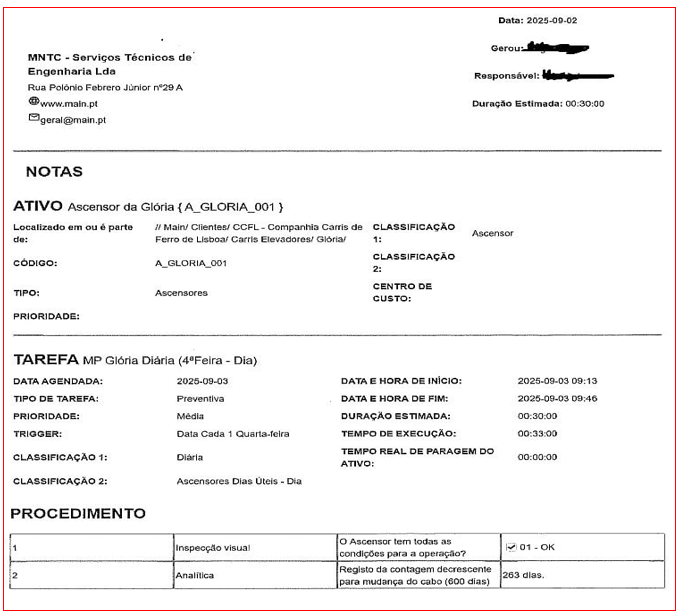 Esta parte merece letras garrafais: “TEMPO REAL DE PARAGEM DO ACTIVO: 00:00:00.” Verificar “na fossa” uma “viagem completa” e, simultaneamente, não registar qualquer paragem operacional levanta dúvidas práticas (e de segurança do próprio técnico). Mais: sem imobilização não há testes de emergência, não há estabilização para medições, não há desmontagens mínimas.