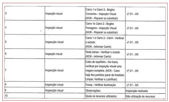 Enfim, mas o “procedimento” reduziu-se, em abono da verdade, a uma sucessão de inspecções visuais assinaladas “01 – OK”. Item 1: “O Ascensor tem todas as condições para a operação?” – OK. Item 2: “Analítica – registo da contagem decrescente para mudança do cabo (600 dias)” – 263 dias. Chama-se analítica, mas é uma mera contagem burocrática. Seguem-se os itens 3 a 8, todos com a mesma matriz: “Inspecção visual” aos bogies, correntes, ferragens, carril, rede aérea, cabo de equilíbrio (“na fossa, verificar por inspecção visual uma viagem completa”) e iluminação da fossa. Tudo OK. No fim, duas linhas lapidares: “Observações: Inspecção realizada.” e “Quais os recursos utilizados: Não utilização de recursos.”