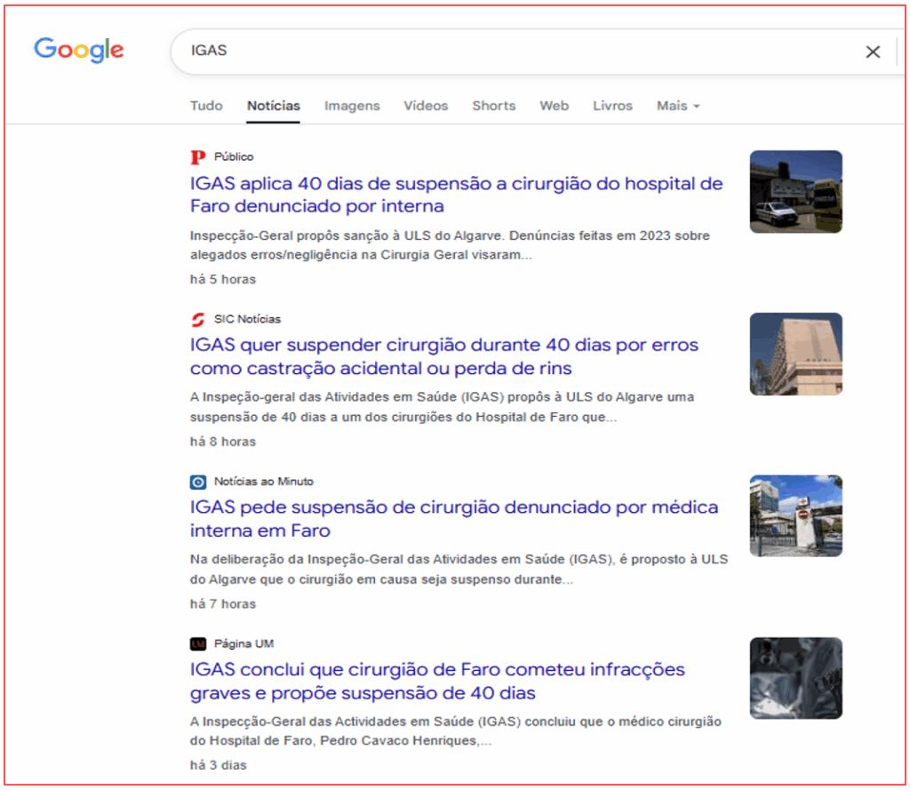 Ora, no sábado, o PÁGINA UM publicou em exclusivo — e depois do acesso ao relatório integral de 59 páginas da Inspecção-Geral das Actividades em Saúde (IGAS) — a notícia de que o cirurgião Pedro Cavaco Henriques foi sancionado com 40 dias de suspensão aplicada ao cirurgião Pedro Cavaco Henriques por cinco infracções graves cometidas em apenas três meses.