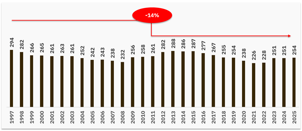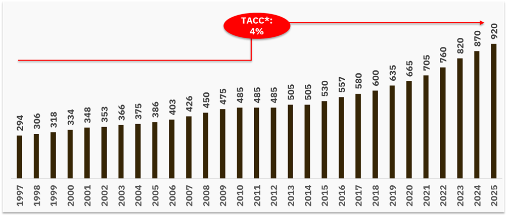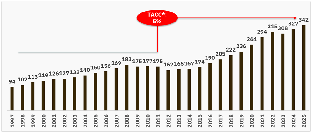 Evolução do agregado M2 entre 1997 e 2025 – previsão com base no valor de Outubro de 2025 (Unidade: milhares de milhões de Euros); Fonte: Banco de Portugal; * Taxa de crescimento anual composta