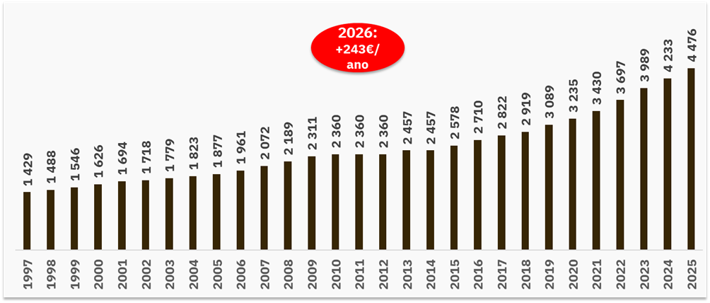 Evolução do valor do salário mínimo entre 1997 e 2025 – para 2025, assume-se o aumento recentemente anunciado (unidade: Euros por mês); Fonte: INE; * Taxa anual de crescimento composta