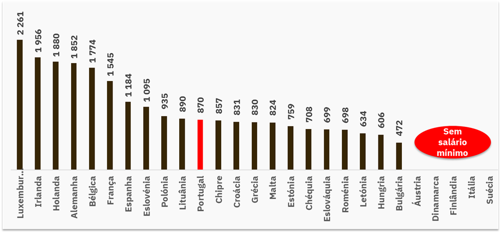 Valor do salário mínimo para os diferentes países da União Europeia (Unidade: Euros por mês; ajustado a 14 salários anuais); Fonte: Eurostat