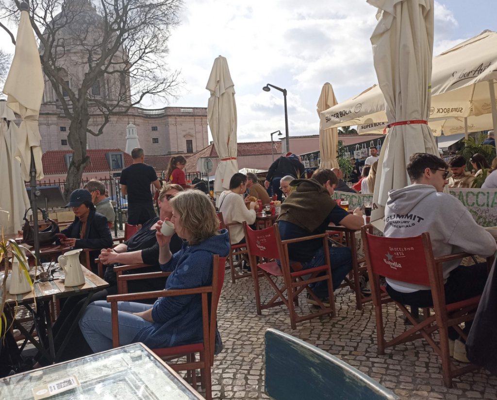 Entro na esplanada com cadeiras de tecido vermelhas patrocinadas pela cerveja Estrella Damm e vejo-me cercado de clientes que se chamam Björn, Astrid ou Henrik. Pareceu-me evidente que aquele estabelecimento foi concebido para atrair turistas, não para satisfazer as necessidades de residentes locais. Quem sou eu para dar conselhos, mas é sempre perigoso tornar-se dependente de um tipo de clientes. Basta um abanão no turismo lisboeta e muitas canoas vão ao fundo.