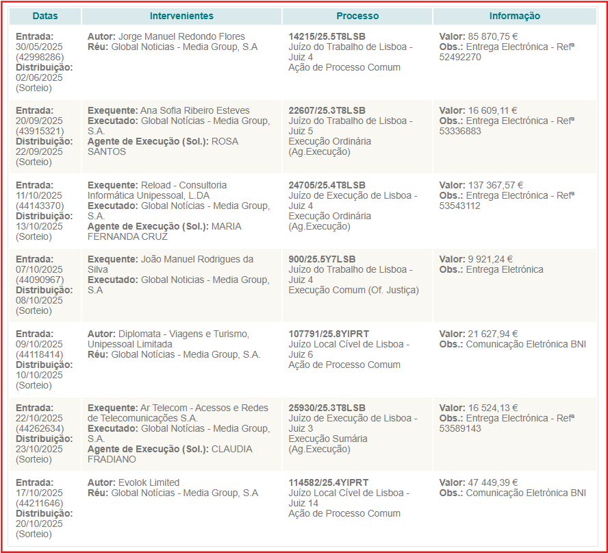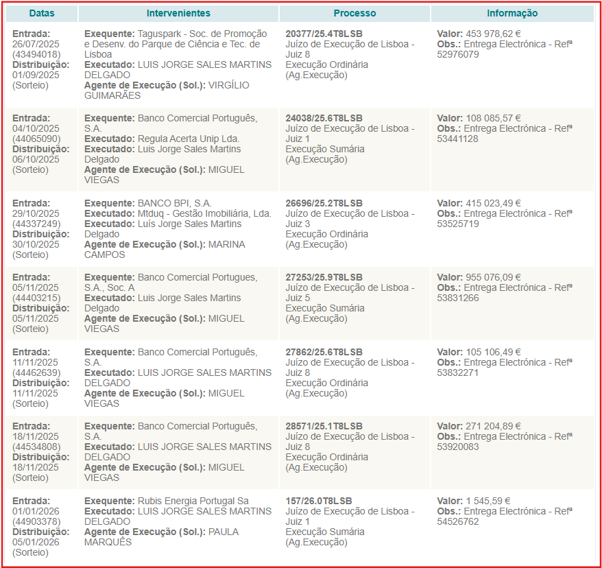 Também o Banco BPI avançou, no dia 29 de Outubro, com uma acção de execução contra Delgado no valor de 415.023,49 euros, sendo que neste processo também é alvo de execução uma outra empresa de Delgado, a Mtduq – Gestão Imobiliária, Lda, a qual não apresenta contas desde 2021.