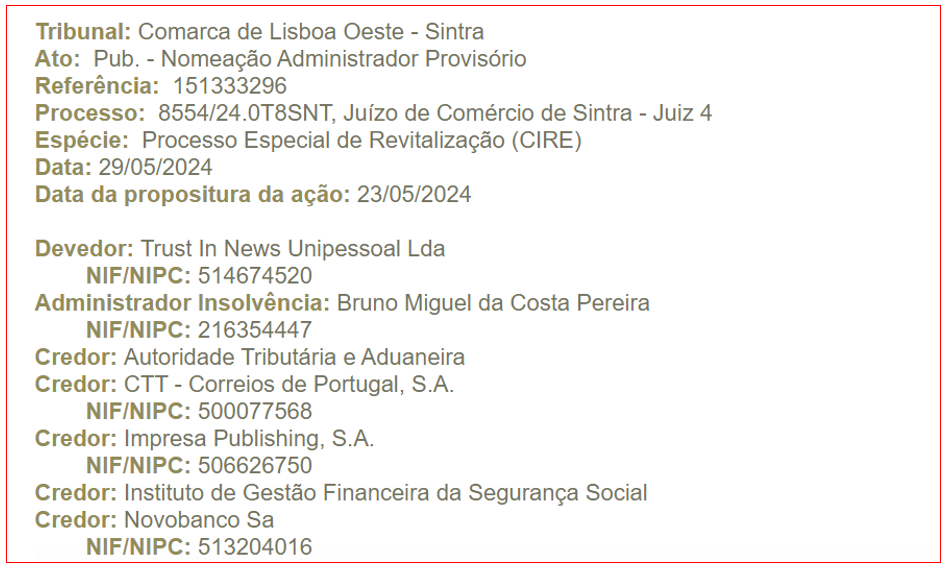A assumpção do não pagamento das contribuições para a Segurança Social, que tem enquadramento penal sobre os gerentes da TIN, surge na identificação dos credores com direitos sobre a empresa media de Luís Delgado. Além da Autoridade Tributária e Aduaneira, da Impresa e do Novo Banco – que o PÁGINA UM já identificara no ano passado –, surgem agora reveladas nos documentos do PER, consultados pelo PÁGINA UM, os créditos reivindicados pelos CTT e também pelo Instituto de Gestão Financeira da Segurança Social.