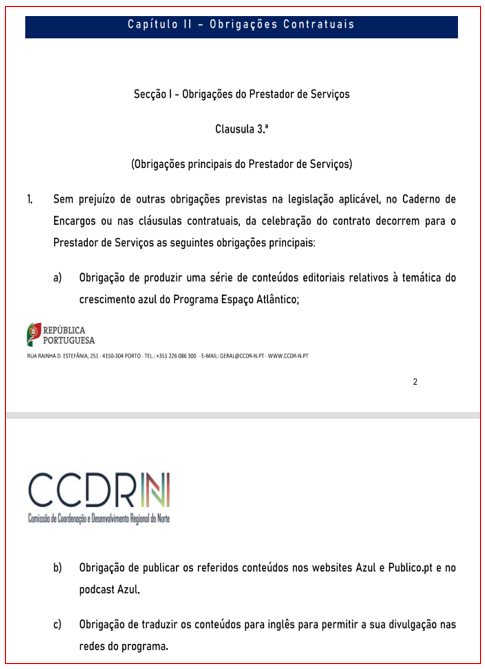 De facto, a troco de 31.000 euros pagos pela CCDR-N no prazo de 60 dias, o Público obriga-se, de acordo com o caderno de encargos, a “produzir uma série de conteúdos editoriais [leia-se, conteúdos jornalísticos e feitos por jornalistas] relativos à temática do crescimento azul do Programa Espaço Atlântico”, de os publicar “nos websites Azul e Publico.pt e no podcast Azul”, mas com uma condição especial: o Público tem de proceder à entrega prévia dos conteúdos para a “respectiva validação” pela CCDR-N.