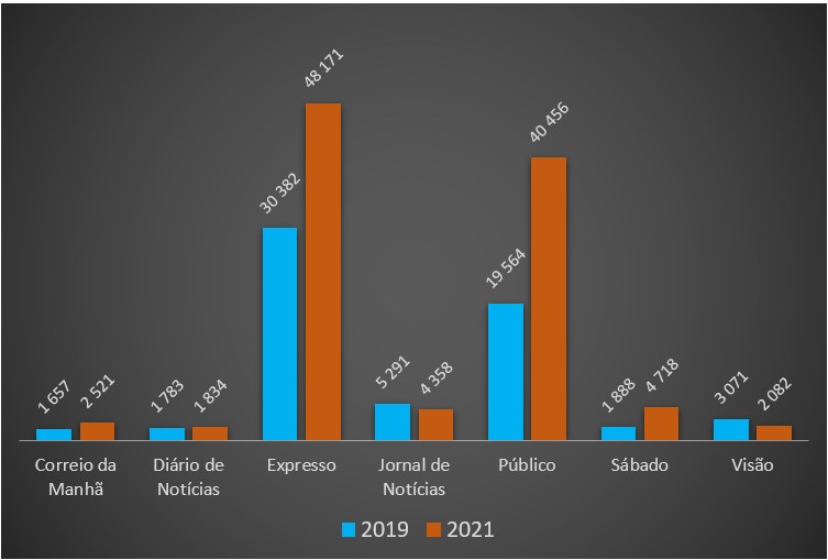 O crescimento no digital deveu-se sobretudo a dois títulos: Público e Expresso, que se estão a transformar em jornais digitais. O conhecido semanário fundado por Pinto Balsemão em 1973 – e que apenas em finais da década de 1990 criou o seu site com cobertura noticiosa diária – registou nos últimos dois anos um crescimento de quase 18 mil assinaturas digitais, passando de 30.382 para 48.171.