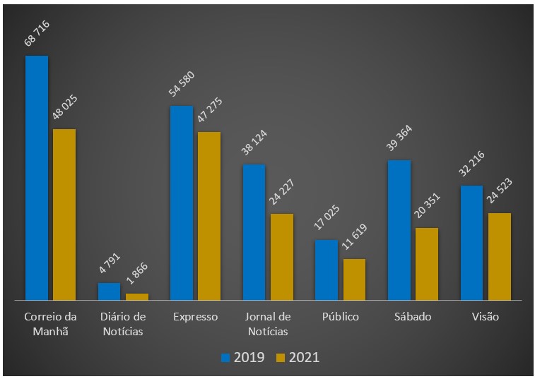 O Jornal de Notícias – que em 2009 ainda vendia acima dos 100 mil exemplares por edição diária – apresentou vendas em banca de apenas 24.227 exemplares no último trimestre do ano passado. Estes valores mostram uma queda de 37% nas vendas de jornal em papel, que nem sequer tiveram qualquer compensação no digital. No período da pandemia a circulação digital até decresceu (menos 933 assinaturas).