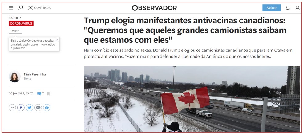 Em causa está uma notícia da autoria da jornalista Tânia Pereirinha, publicada em 30 de Janeiro passado, intitulada “Trump elogia manifestantes antivacinas canadianos: ‘Queremos que aqueles grandes camionistas saibam que estamos com eles’“. Apesar de a jornalista referir que “o protesto [era] organizado contra a lei que vai obrigar os camionistas que cruzem a fronteira entre os Estados Unidos e o Canadá a apresentar certificado de vacinação contra a Covid-19” – e não contra as vacinas –, acabava por apelidar os manifestantes de “antivacinas”, tanto no título como no lead.