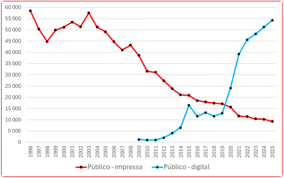 Hoje, o Público vende menos de 10 mil exemplares por dia em banca — número que o próprio jornal esconde ou relativiza, enquanto promove campanhas de assinaturas digitais inflacionadas, muitas delas associadas a parcerias pouco transparentes com instituições públicas e privadas. A ilusão de crescimento digital sustenta-se, em parte, em contas de acesso gratuito por protocolos com escolas, universidades e autarquias, sem que tal se traduza em rentabilidade ou fidelização efectiva de leitores.