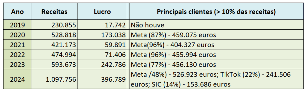 Assim, entre 2020 e 2024, a Meta terá transferido para a Inevitável e Fundamental mais de 2,3 milhões de euros, entre contratos directos e financiamentos — um valor sem paralelo no ecossistema mediático português. Importa, aliás, recordar que, nos primeiros anos do projecto, antes da pandemia da covid-19 e sem o “sugar baby” do Facebook, os resultados da empresa eram modestos: em 2019, registou 230.855 euros de receitas e apenas 17.742 euros de lucro líquido — números que contrastam brutalmente com o desempenho posterior. Em cinco anos, as receitas da empresa de Fernando Esteves mais que quadruplicaram e os lucros cresceram 23 vezes.