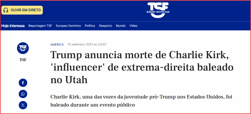 Nesta notícia não assinada por nenhum jornalista, publicada no dia do assassinato de Charlie Kirk, a TSF classificou o jovem cristão e conservador como sendo de “extrema-direita”, o que é falso. / Foto: D.R.