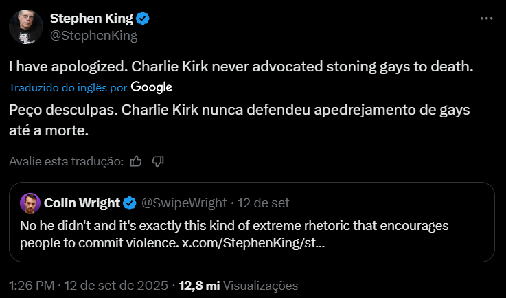 De resto, não é só nas notícias que tem havido desinformação sobre Kirk ou enviesamento no tratamento deste homicídio. É frequente encontrar publicações em que, por exemplo, frases de Kirk são usadas fora de contexto. E proliferam acusações difamatórias em relação a Kirk. Por exemplo, o famoso autor Stephen King, que na rede social X tem 6,8 milhões de seguidores, veio pedir desculpa por ter escrito numa publicação que Charlie Kirk “defendia o apedrejamento até à morte de pessoas gay”, o que é totalmente falso.