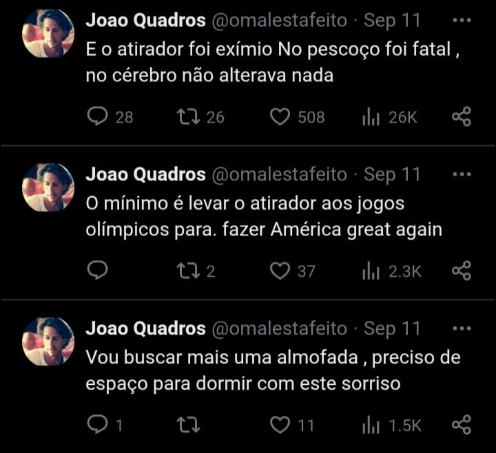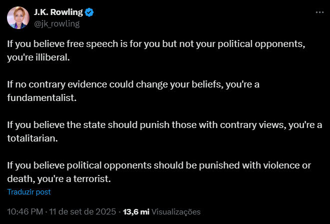 Já a popular escritora J.K. Rowling, autora de Harry Potter, que tem 14,4 milhões de seguidores na rede X, fez uma publicação no dia 11 de Setembro contra a violência e em defesa do debate, da democracia e da liberdade de expressão. “Se acredita que a liberdade de expressão é para si, mas não para os seus opositores políticos, você é anti-liberal. Se nenhuma evidência contrária puder mudar as suas crenças, você é um fundamentalista. Se acredita que o Estado deve punir aqueles com opiniões contrárias, você é um totalitário. Se acredita que opositores políticos devem ser punidos com violência ou morte, você é um terrorista.”