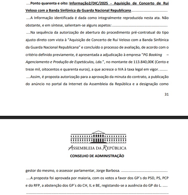 Porém, o PÁGINA UM sabe que, já depois da assinatura do contrato, e sabendo-se já da realização de eleições antecipadas, a secretaria-geral ponderou a suspensão do concerto, decidindo dar a última palavra à Conferência de Líderes. Esta estrutura – formada pelo presidente do Parlamento, José Pedro Aguiar-Branco, e dos deputados Hugo Soares (PSD), Alexandra Leitão (PS), Pedro Pinto (Chega), Mariana Leitão (Iniciativa Liberal), Fabian Figueiredo (BE), Isabel Mendes Lopes (Livre), Paula Santos (PCP) e Paulo Núncio (CDS) – acabou por aprovar a manutenção do concerto.