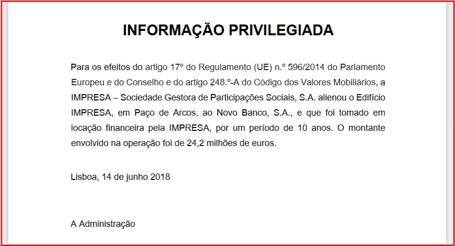 Em 2018, a Imprensa emitiu uma informação ao mercado, informando os investidores da venda do seu edifício-sede. Mas, em 2022, nenhum comunicado foi feito ao mercado. Para a CMVM, o mercado não precisava saber deste negócio e do novo empréstimo da Impresa através de um comunicado. A Impresa remeteu informações para os seus Relatórios e Contas, mas não se encontra nenhuma referência ou nota a explicar a operação de compra do seu edifício ao Novo Banco.