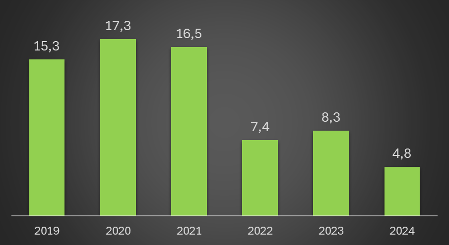 Lucros da SIC (em milhões de euros), que acabaram por ser canalizados como dividendos para a Impresa, No caso dos lucros de 2024 ainda não houve decisão em Assembleia Geral. Fonte: Relatórios e contas da SIC.