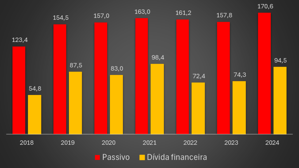 Evolução do passivo e da dívida financeira (em milhões de euros) SIC. Valores de 2024 referentes ao primeiro semestre. Fonte: Relatórios e contas da SIC.