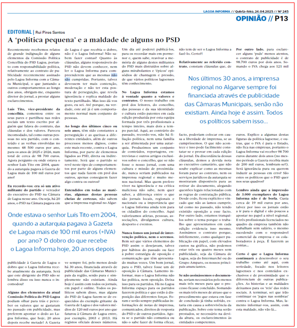 O director do ‘Lagoa Informa’ garante que, no passado, a ‘Gazeta de Lagoa’ – um jornal actualmente inactivo, embora ainda registado na ERC, em nome de Ana Maria Jesus Linha – teria recebido da autarquia local “valores médios de 120 mil euros por ano […] entre, por exemplo, 2003 e 2013.”, acrescentando que “há registos oficiais desses números”. E promete que “um dia até poderei publicá-los, para os recordar mais em pormenor e, quem sabe, reavivar a memória de alguns destes militantes do PSD mais distraídos sobre alguns mirabolantes e ‘épicos’ episódios de chantagem e pressão, de que vários políticos lagoenses têm conhecimento”.