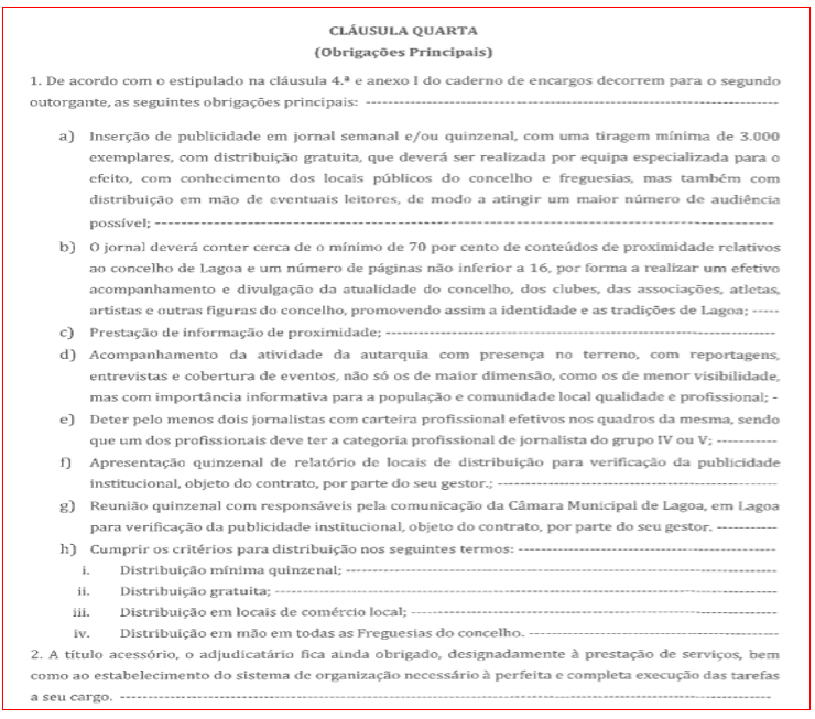 Mas o pior surge nas cláusulas seguintes.. Segundo o contrato, por imposição da autarquia de Lagoa, o jornal da Pressroma está ainda obrigado a prestar informação de proximidade, que inclui acompanhar a actividade da autarquia com “presença no terreno”, através de “reportagens, entrevistas e cobertura de eventos, não só os de maior dimensão, como os de menor visibilidade, mas com importância informativa para a população e comunidade local, com qualidade e profissionalismo”. E para isso tem de dispor de pelo menos “dois jornalistas com carteira profissional”. Para aumentar o controlo, a Pressroma deve apresentar relatórios quinzenais de distribuição e reunir quinzenalmente com responsáveis da Câmara Municipal..