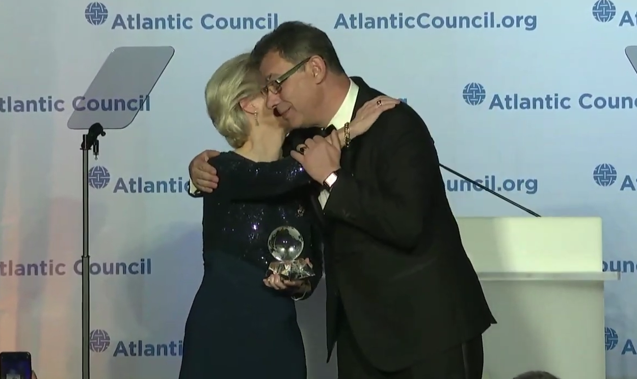 Ursula von der Leyen, presidente da Comissão Europeia, e Albert Bourla, presidente-executivo da Pfizer, na entrega de um prémio do Atlantic Council, em Novembro de 2021. (Foto: Captura a partir de vídeo do evento)