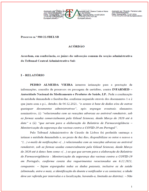 Já passaram cerca de 950 dias desde que, em Dezembro de 2021, o PÁGINA UM pediu acesso aos registos anonimizados das reacções adversas às vacinas contra a covid-19 (e também ao antiviral remdesivir). Nesse longo intervalo de mais de dois anos e sete meses, houve um parecer da Comissão de Acesso aos Documentos Administrativos, uma intimação no Tribunal Administrativo de Lisboa, com uma sentença enviesada, e agora um acórdão histórico do Tribunal Central Administrativo Sul. O Infarmed, segundo o acórdão, tem agora cinco dias para se tornar transparente e mostrar, linha a linha, quais foram os efeitos adversos de um programa vacinal em massa que nem crianças e jovens saudáveis ‘poupou’, apesar da virtualmente nula letalidade nessas idades. O PÁGINA UM não pretende ter acesso aos registos anonimizados para criar “alarme público”, mas tão-só para que se saiba a verdade dos factos – como é a regra (talvez esquecida por muitos) do jornalismo (verdadeiramente) independente.