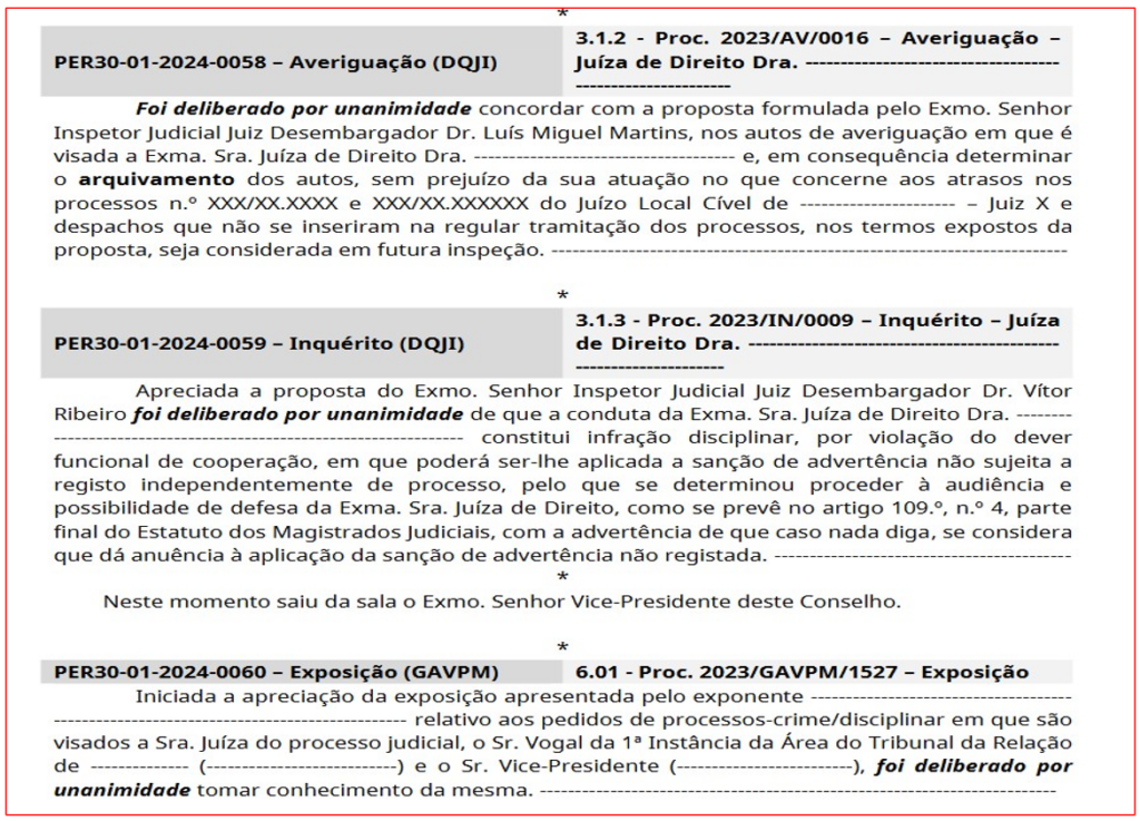 Há casos de absurda omissão, que pode determinar prejuízo tanto para advogados como arguidos em processos. E, claro, nada abona sobre a transparência da Justiça. Por exemplo, no ponto 16 do Plenário de Setembro do ano passado, foi confirmada a classificação de “Medíocre” de uma juíza sob proposta do desembargador Filipe Caroço, perfeitamente identificado em acta. E quem é essa juíza? A acta ‘esclarece’: é a “Senhora Juiz de Direito Dra. XXX” que exerceu no “Juízo Local Cível de XXX, Juiz X (Comarca de XXX)”, entre 7 de Abril e 31 de Agosto de 2022, e saltou depois, entre Setembro de 2022 e Abril de 2024, para o “Juízo Local Cível de XXX, Juiz X (Comarca de XXX)”.