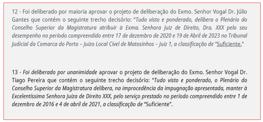 Na reunião de Janeiro do ano passado, de entre 29 deliberações, há cinco oitos de ‘XXX’. No ponto 12 fica-se a saber que foi deliberado por proposta do “Senhor Vogal Dr. Júlio Gantes” atribuir a classificação de “Suficiente” (aparentemente uma má nota) à “Dra XXX pelo seu desempenho no período compreendido entre 17 de dezembro de 2020 e 19 de Abril de 2023 no Tribunal Judicial da Comarca do Porto – Juízo Local Cível de Matosinhos – Juiz 1”. No ponto seguinte, a “Juíza de Direito XXX” viu ser-lhe negada a pretensão de melhorar a nota que lhe fora atribuída, não ficando sequer em acta em que juízo desempenha funções.
