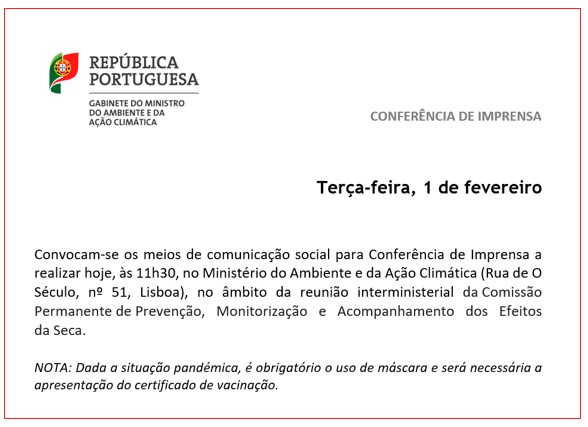 A nota de imprensa do gabinete do ministro Matos Fernandes – que esteve presente numa conferência de imprensa no passado dia 1, terça-feira, para abordar o problema da seca e dos baixos níveis de armazenamento das albufeiras – informou previamente os jornalistas que “dada a situação pandémica, é obrigatório o uso de máscara e será necessário a apresentação de certificado de vacinação”.