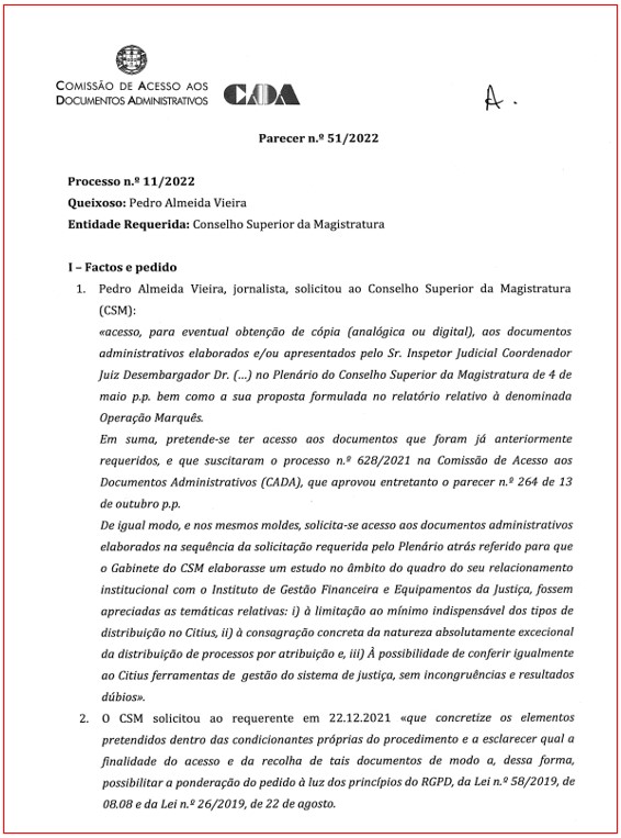 Mais tarde, após o parecer favorável da CADA, o CSM reiterou a recusa, recordando que os pareceres daquela entidade “não são vinculativos”, e desafiava “o requerente [director do PÁGINA UM] querendo, intentar respetiva acção especial de acesso a documento administrativo”.