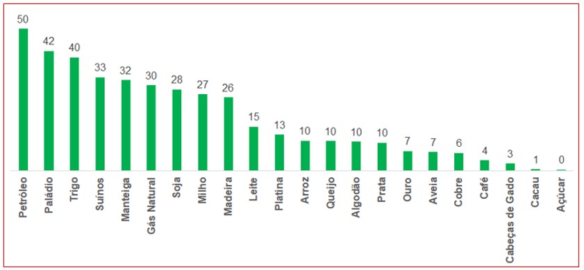 Variação (%) de preços de matérias-primas entre 31 de Dezembro de 2021 e 2 de Março de 2022. Fonte: Yahoo Finance.