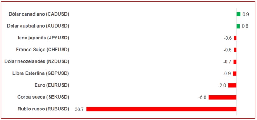 Evolução (%) das principais dividas face ao dólar americano (USD) em 2022, até 2 de Março. Fonte: Yahoo Finance.