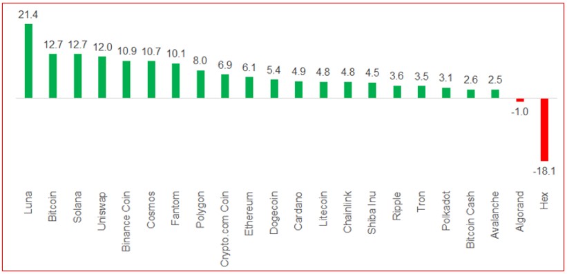 Não por acaso, o Bitcoin foi a Criptomoeda em maior destaque na última semana, com uma subida de 13%, apenas superada pela Luna – esta por razões que irei analisar no final do artigo.