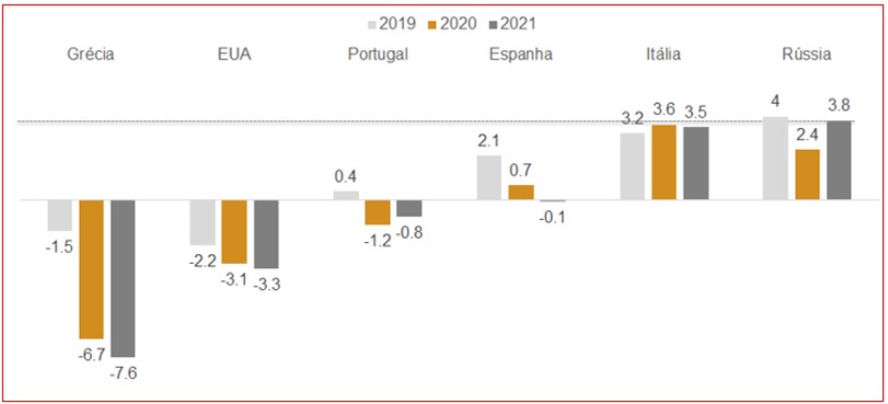 Evolução do rácio balança de transacções correntes/PIB (%) na Grécia, Estados Unidos, Portugal, Espanha, Itália e Rússia no triénio 2019-2021. Fonte: Eurostat, FED; Trading Economics.
