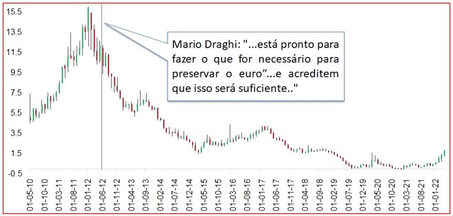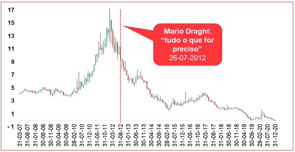 O BCE emite “dinheiro do ar”, ou seja, credita reservas aos bancos comerciais e adquire essas obrigações, obviamente com lucro para os bancos. Vamos imaginar que as compra por 200 Euros – não nos podemos esquecer que para a Senhora Lagarde dinheiro não lhe custa e nunca é um problema; desta forma, o juro implícito passa a ser 5% (5÷200). Por isso, nos últimos anos as taxas de financiamento do Estado português não pararam de descer, era “o milagre dos mercados”. Os bancos podem assim amortizar a dívida e embolsar 1000 Euros;