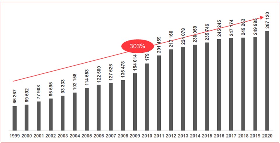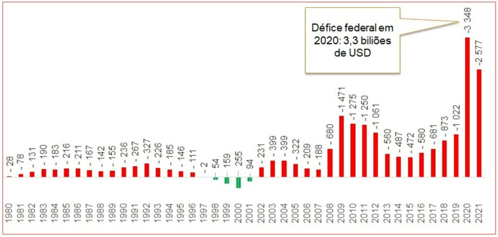 Evolução do rácio dívida pública/PIB (%) na Grécia, Itália, Portugal, Estados Unidos e Rússia no triénio 2019-2021. Fonte: Eurostat, FED; Trading Economics.