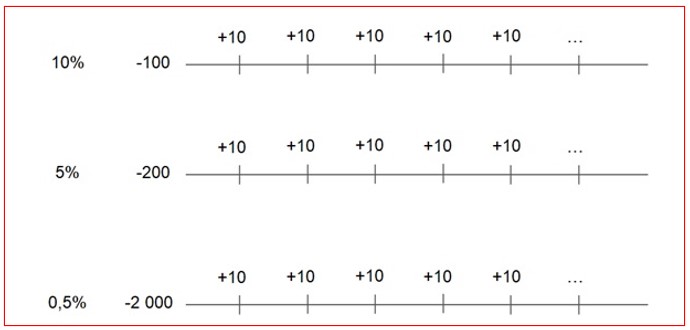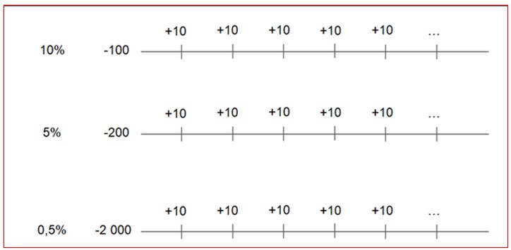 Vamos imaginar que após a realização do leilão, apura-se um preço de 100 Euros por obrigação, com um cupão anual (juros) de 10 euros, ou seja, um juro implícito de 10% (10 ÷ 100);