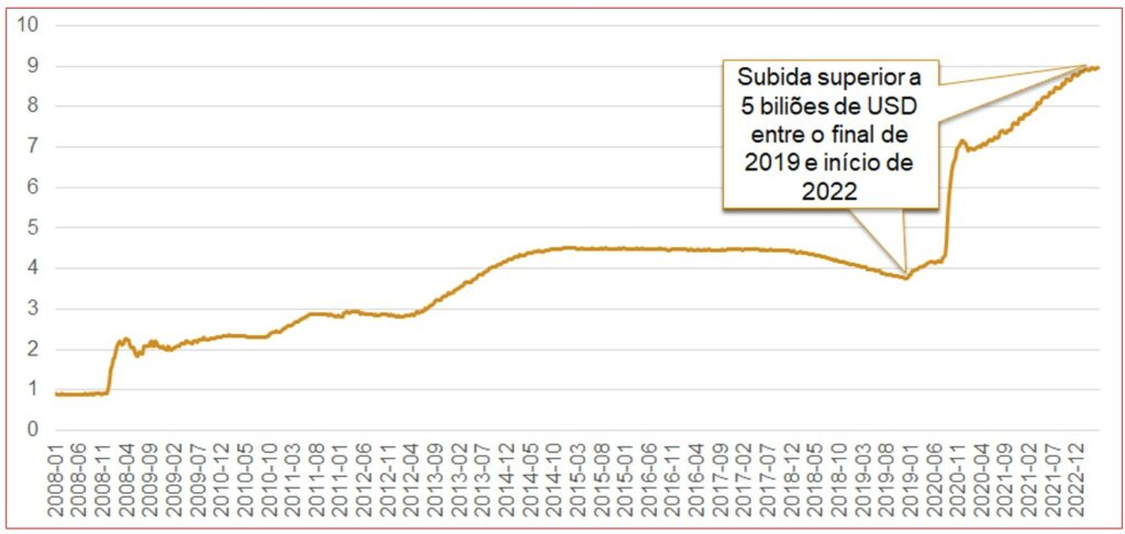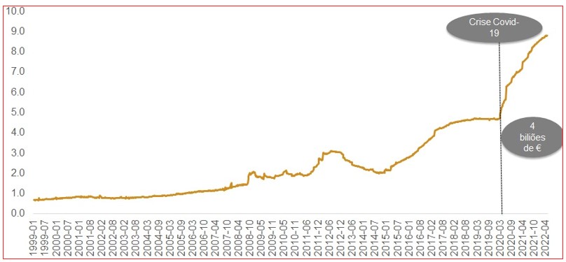 Evolução do balanço do Banco Central Europeu (em biliões de Euros) entre 1999 e 2022. Fonte: FRED Economic Data (análise do autor)