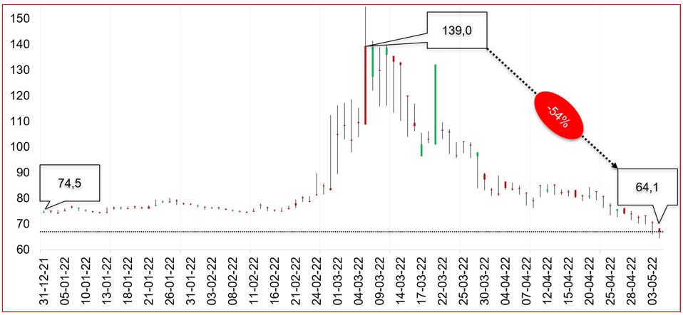 Para termos uma ideia do descalabro, podemos observar que o petróleo regista uma subida de 50% em 2022, de 66 €/barril no final de 2021 para 99€/barril no final da sessão do dia 2 de Março.