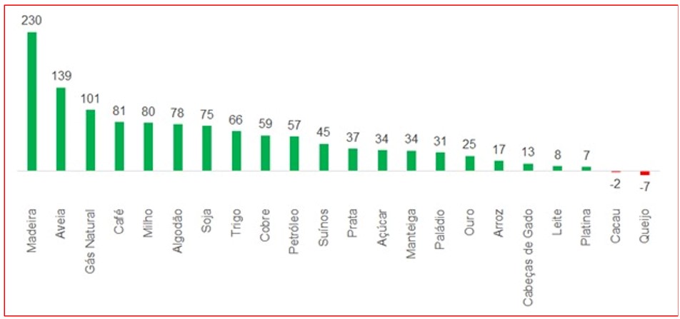 Evolução (%) do preço das principais matérias-primas entre finais de 2019 e Fevereiro de 2022. Yahoo Finance (contratos de futuros).