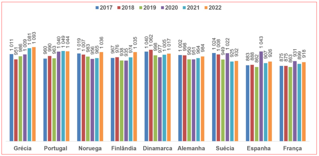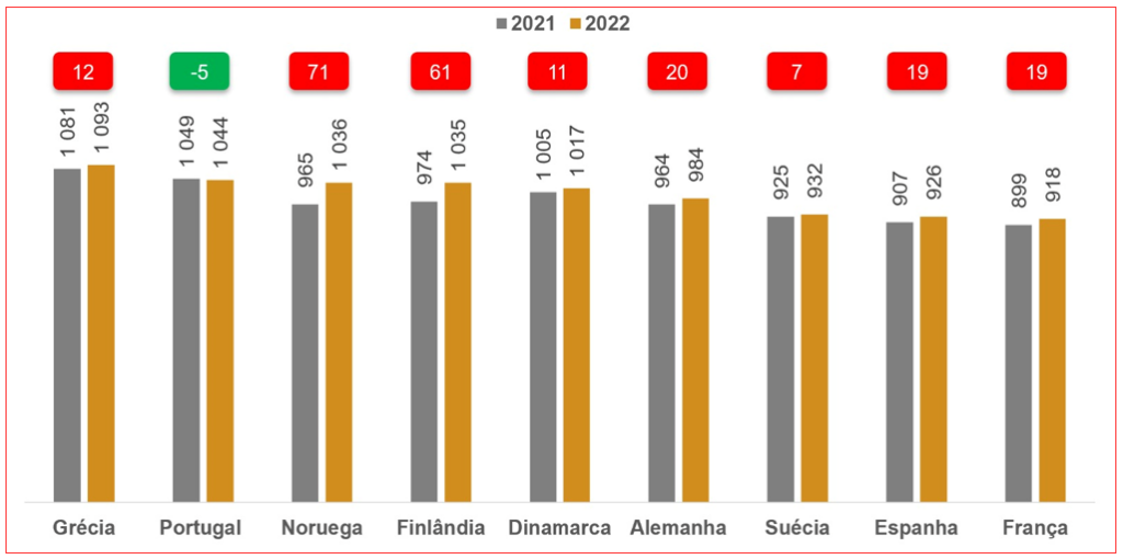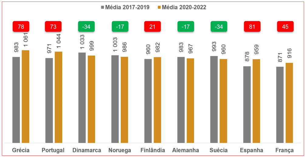 Analisando a média de óbitos por 10 mil habitantes para o mesmo grupo etário, em particular comparando o triénio 2020-2022 vs. 2017-2019, podemos constatar que a Suécia apresenta o melhor desempenho, com uma queda de 34 óbitos por 10 mil habitantes, uma vez mais melhor que os demais países nórdicos – nem vale a pena falarmos do desastre Portugal.